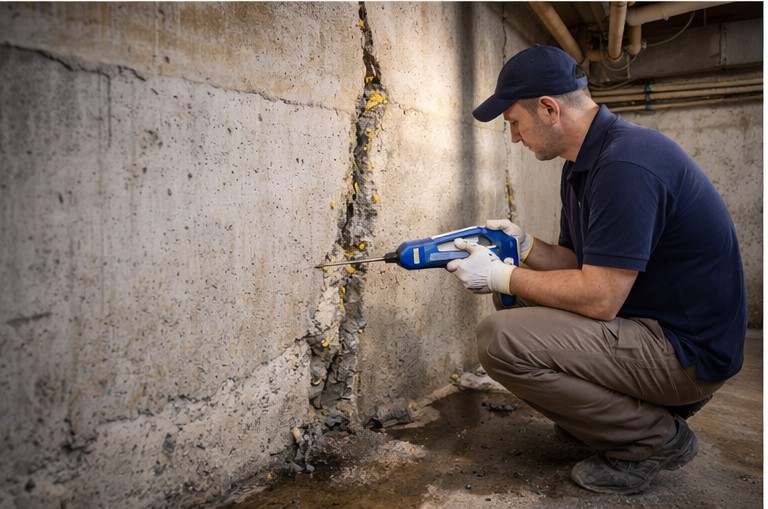 High-pressure polyurethane or epoxy injections to seal concrete cracks and permanently stop leaks or foundation weakening.